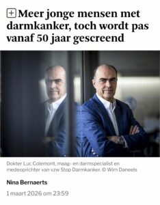 “Er komt een lawine aan darmkankers op ons af!”, zegt Dr. Luc Colemont. Mensen die het krijgen worden immers steeds jonger. Vandaag zijn er gratis tests vanaf 50 jaar, maar hij wil die leeftijd graag naar 45 jaar zien zakken. Hij vertelt er uitgebreid over in zijn nieuwste boek ‘De Grote Boodschap’ dat op maandag 4 november is verschenen.