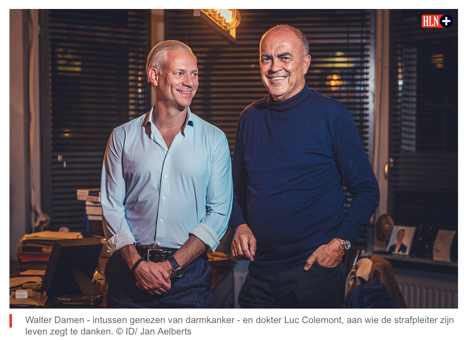 “Het is mijn eigen fout dat ik darmkanker kreeg, dwaas die ik was.” Straffe uitspraak van de Antwerpse strafpleiter Walter Damen (54), die hier voor het eerst openlijk getuigt over de ziekte die hem – door complicaties – bijna fataal werd. Hij zegt zijn leven te danken aan dokter Luc Colemont (68). “Mocht Luc zich niet zo onvermoeibaar inzetten voor het vroegtijdig opsporen van darmkanker, dan was ik misschien al dood geweest.”